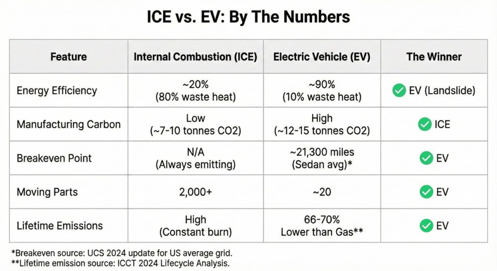 But here is the real kicker: The ICE car has hit its peak. A gas engine bought today will never get cleaner. In ten years, it will burn the same dirty fuel it burns today. An EV gets cleaner as the grid gets cleaner. Your EV effectively upgrades its own fuel source while it sits in your driveway.